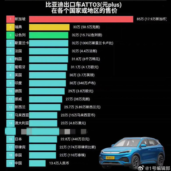 据本站了解,根据网友总结的数据,BYD ATTO 3在各个国家或地区的售价存在明显差异。新加坡市场的售价高达85万元,几乎可以称之为“百万豪车”。而在其他国家市场,BYD ATTO 3的价格也在30万元以上,如瑞典为33万元,以色列和法国为32万元,韩国为31.8万元,葡萄牙为31.1万元,英国和印度的价格为30万元。虽然价格相对较高,但这款车在海外市场依然受到不少消费者的追捧。