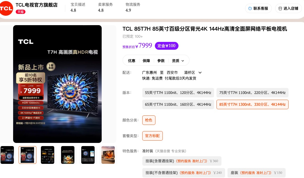 其实想选择真HDR电视,关注两点就OK了,也就是峰值亮度和背光分区,前者必须做到1000nits以上,后者必须做到300级以上,只有符合这个级别或者在这个级别之上才能完美还原HDR画面。我在网上搜罗了一圈最近新出的电视,发现TCL有一款很符合我的需求,就是正在预售的T7H,最高做到了1300nits 的峰值亮度和330级背光分区,完美符合高画质真HDR电视的标准。