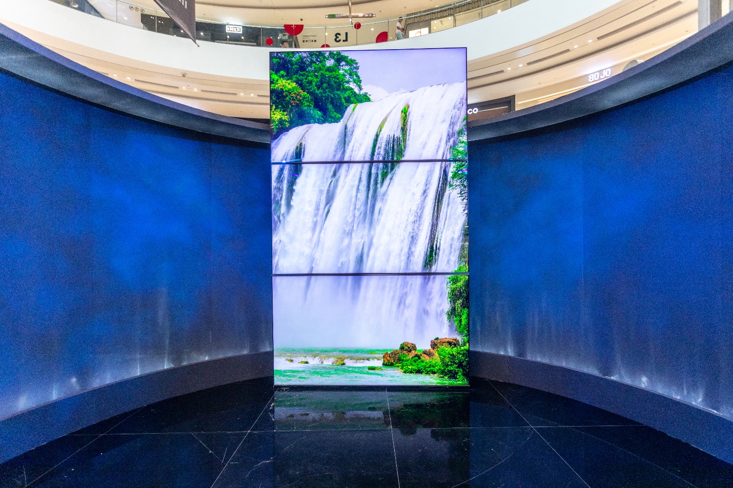 走近“Big Screen 全景沉浸式体验馆”,飞流直下的瀑布景观让进入体验区的消费者仿佛走进了真实的自然环境中,周身的光影特效配合水纹细节的呈现,给观众以身临其境的感官冲击。