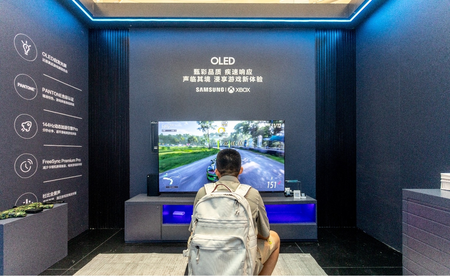在专为电竞发烧友搭建的电竞房内,三星 OLED电视以臻品画质、流畅性能加码玩家流畅操作。画面呈现上,该电视采用三星OLED自发光面板配合量子点显色技术,通过像素级精准控光实现量子点HDR亮度增强,真实还原丰富的屏幕色彩。搭配神经元量子点处理器,还可实时解析并优化画面内容,从色彩纯度、亮度与对比度等方面重塑屏幕画质,真实还原游戏世界。值得一提的是,该电视是全球首款获得潘通(Pantone)色彩权威认证的OLED电视,这意味着其出色的画质和表现力足以满足玩家对游戏色彩的高需求。此外,该系列电视拥有动态加速引擎 Pro 技术,支持高达4K 144Hz的动作增强,还获得了AMD FreeSync Premium Pro技术认证,高刷新率、不拖影、不掉帧,助力玩家以丝滑操作勇获佳绩。