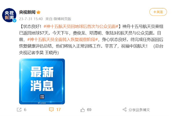 【本站】7月31日消息,据央视新闻报道,中国载人航天神舟十五号乘组今天下午与公众见面,这标志着他们已经返回地球57天。费俊龙、邓清明、张陆三名航天员在与人们见面时展现了良好的身心状态。神舟十五号的载人飞行任务是中国空间站建设阶段的最后一次飞行任务,从酒泉卫星发射中心发射升空后,与天和核心舱对接形成组合体。