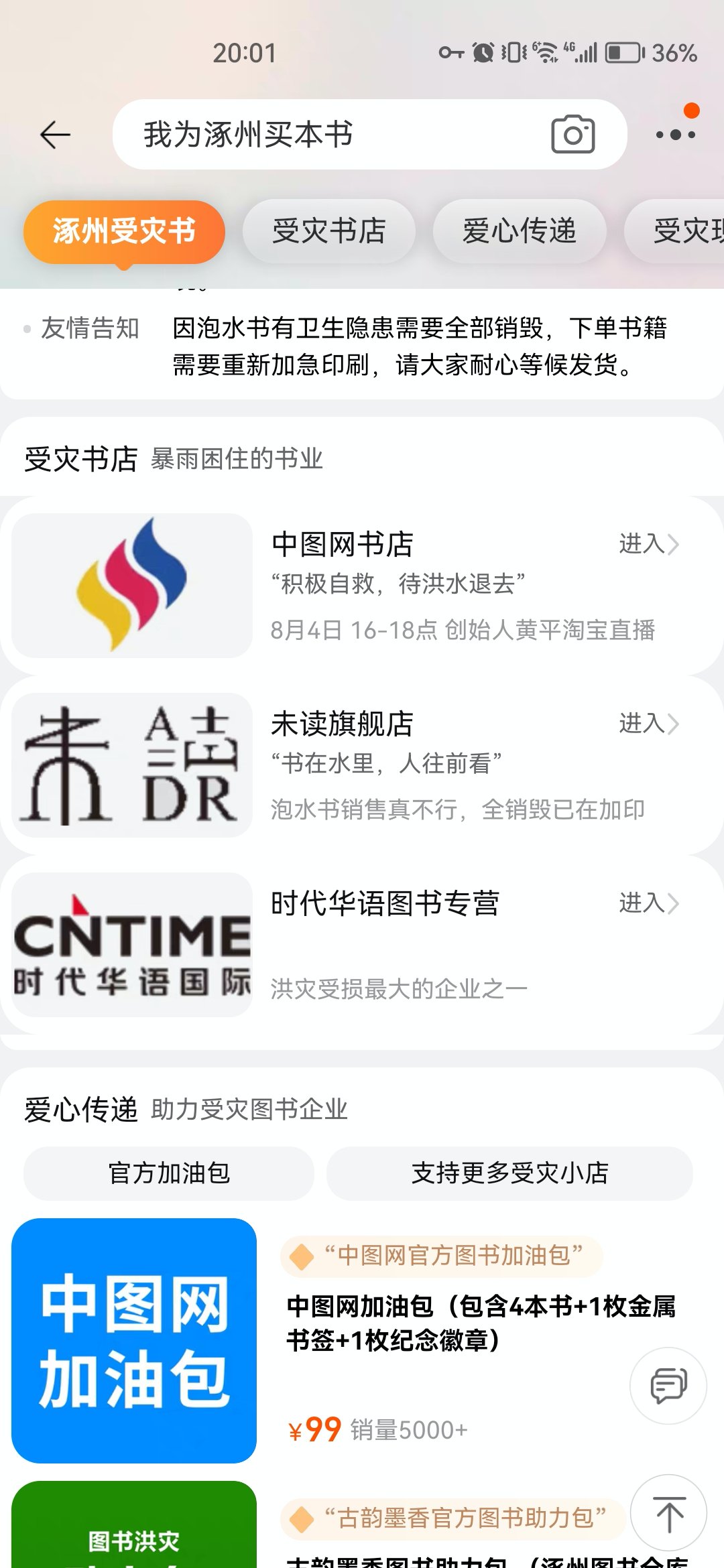 (图片:8月4日,淘宝紧急上线了“涿州图书专场”,已有近百家受灾商家报名)