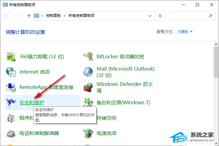 2. 打开控制面板之后,我们在控制面板页面中找到“安全和维护”选项,点击打开该选项。