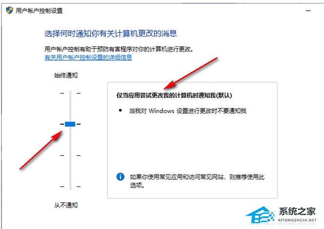 4. 进入“更改用户帐户控制设置”页面之后,我们可以看到当前的设置为“仅当应用尝试更改我的计算机时通知我”,想要更改该设置,我们需要向下拖动左侧的滑块。