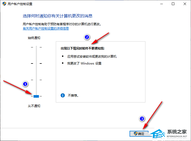 5. 我们将滑块拖到最底端,让设置变为“出现以下情况时始终不要通知我”,然后页面下方的点击“确定”选项即可。