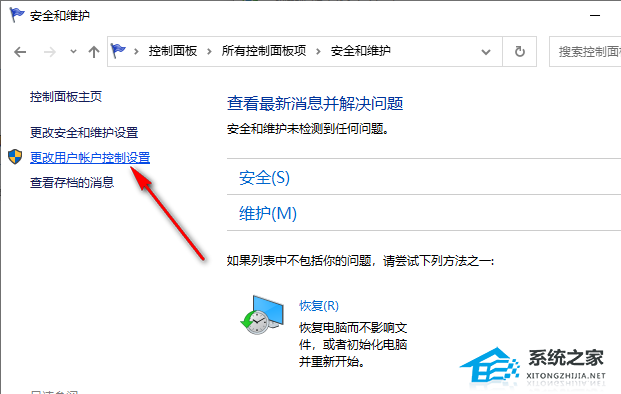 3. 进入安全和维护页面之后,我们在该页面的左侧列表中点击打开“更改用户帐户控制设置”选项。