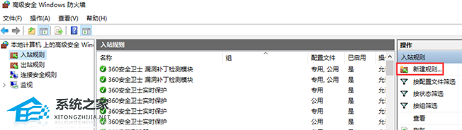 3、点击左侧的“入站规则”,再点击右侧中的“新建规则”选项。