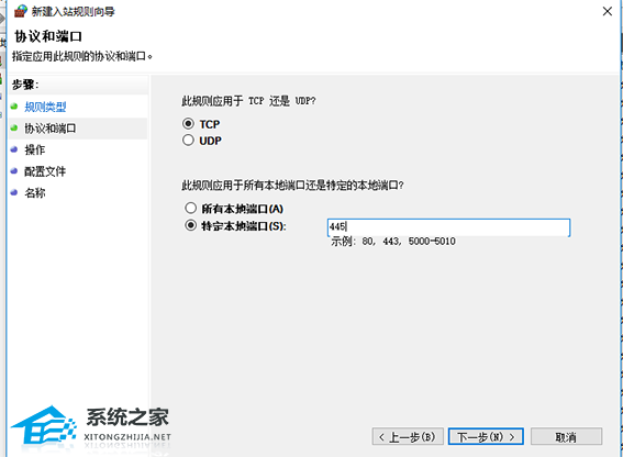 (说明添加完445端口后重复上述步骤继续添加135端口,协议类型选择TCP,到此端口输入135)