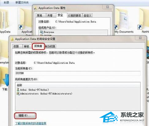 2、 在这个高级安全设置里面选择所有者,然后这里我们可以看到这个文件夹的权限只是赋予了SYSTEM,因此你是管理员帐户也无法访问。此时点击下面的编辑。