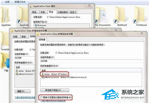 3、 然后在弹出的窗口双击用户帐户,同时要选择下面的“替换子容器和对象的所有者”。假如不选择的话,还是无法打开文件夹下面的子文件的,选择好后点应用。