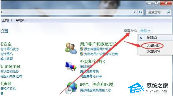 3、然后我们点开查看方式选项,点击之后会出现两个选项。一个为大图标另一个为一个小图标,这时选择大图标选项。