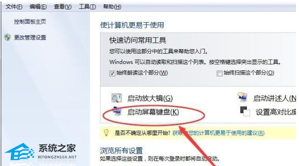 5、然后进入到轻松访问中心页面,就可以看到有一个启动屏幕键盘选项。