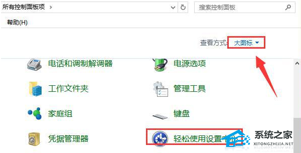 4、在大图标显示页面,找到轻松访问中心选项,点击轻松访问中心选项。