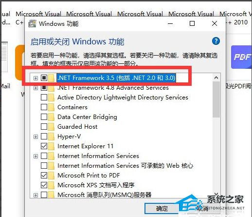 5、在弹出的窗口中勾选、NET FRAMEWORK3、5服务选项,点击确定。再进行下载,如果还是无法安装,我们采用dism命令。