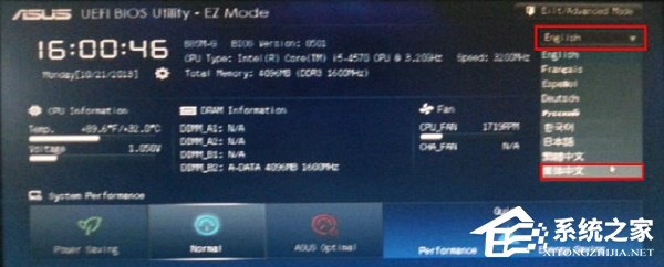 1、首先开机在出现华硕logo时按下热键进入bios设置,然后在右上角将语言改为“简体中文”。