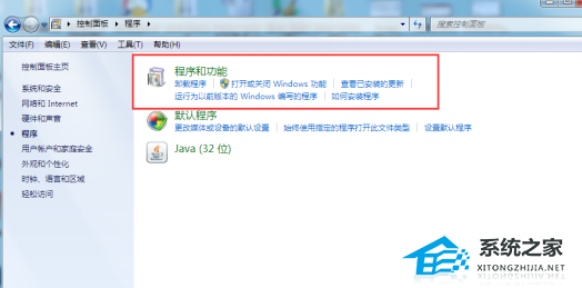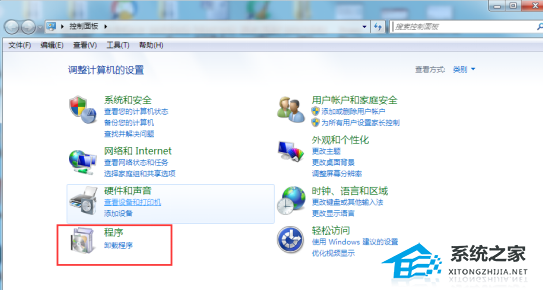 3、打开电脑的控制面板,进入程序选项,选择程序与功能。