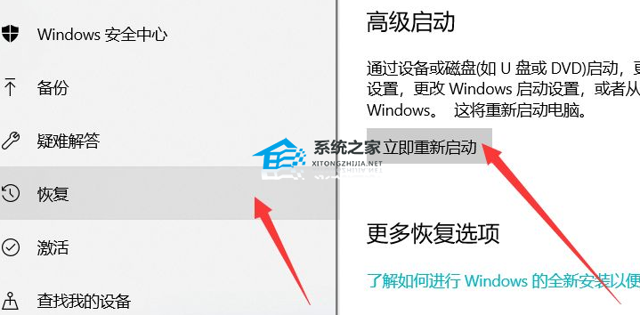 3. 打开更新和安全,左侧的“恢复”,点击高级启动中的“立即重启”按钮。