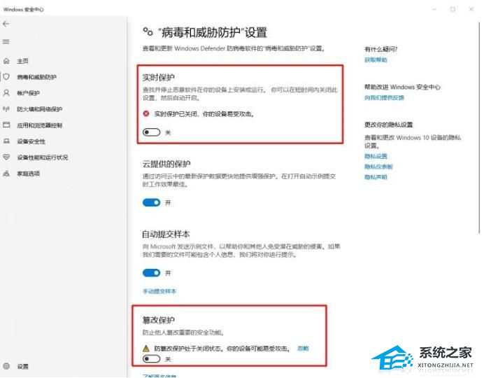 第一步:打开Defender设置,关闭“实时保护”和“篡改保护”。