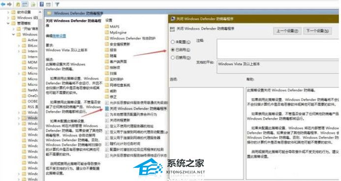 4. 右侧双击“关闭 Windows Defender 防病毒程序”,然后在弹出对话框中选择“已启用”,然后点击确定即可。