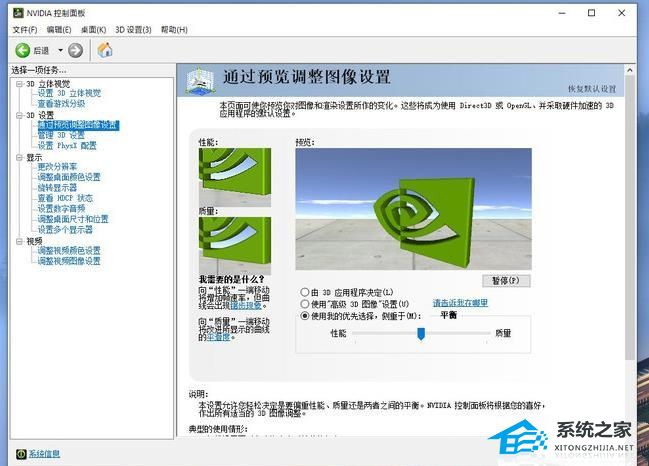 调整显卡的3D设置也是日常中一个立竿见影的方法,N卡A卡都适合。右击桌面空白部位,选择“Nvidia控制面板”(以N卡为例),接下来进入“3D设置→通过预览调整图像设置”标签,选择“使用我的优先选择,侧重于”。接下来根据实际情况将滑杆调至“平衡”或“性能”,反复进入游戏测试即可。