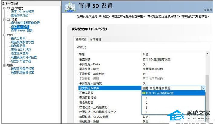 这项功能能够明显提升游戏性能,尤其当硬件相对于游戏偏低时更加明显。除此之外,“3D设置→管理3D设置→全局设置”里的“最大预渲染帧数”也有类似的效果,根据实际情况调整即可。