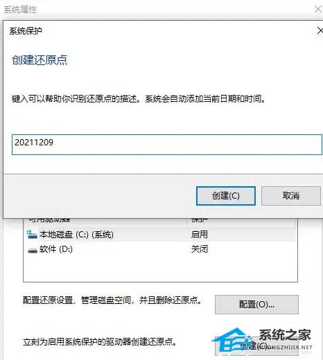 6、在输入框中输入还原点名称,一般建议可以用日期命名,填好后点击“创建”。等待创建还原点完成。