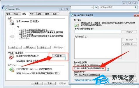 2. 勾选完成后,点击界面中的“设置”按钮,然后在设置中取消勾选“阻止弹出窗口时显示信息栏”就可以了。