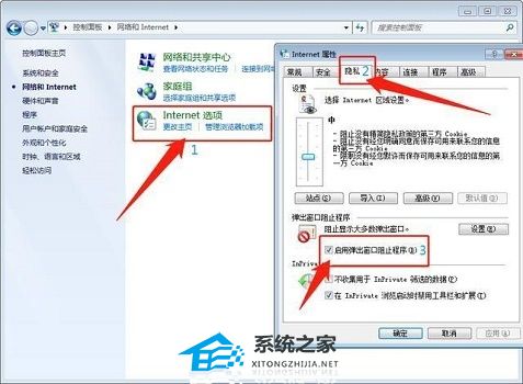 1. 首先我们在“开始”菜单中打开“控制面板”。进入后,依次点击“网络和Internet”—“Internet选项”—“隐私”然后勾选“启用弹出窗口阻止程序”。