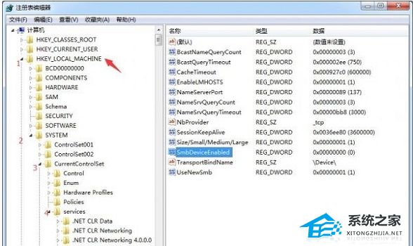 2. 依次打开HKEY_LOCAL_MACHINE—System—CurrentControlSet—Services—NetBT—Parameters。