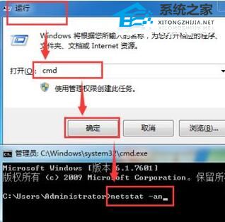 4. 再次打开“运行”,输入“cmd”,回车确定,在图示位置输入“netstat -an”,按下回车,就可以打开445端口了。