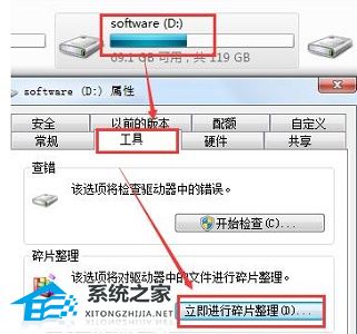1. 右键进入磁盘属性,在工具选项卡下进行碎片整理。