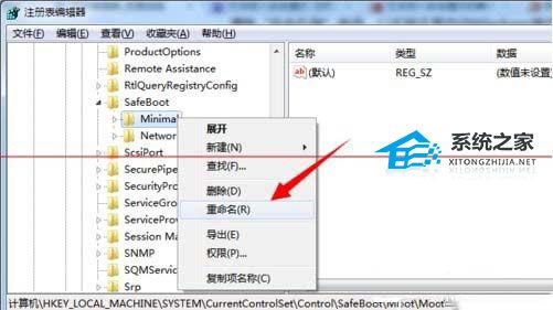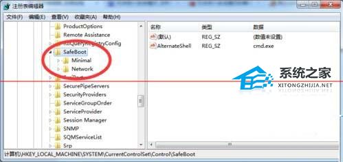 2. 从打开的“注册表编辑器”界面中,依次进入“HKEY_LOCAL_MACHINESYSTEMCurrentControlSetControlSafeBoot”,在此可以看到“Minimal”及 “Network”项。