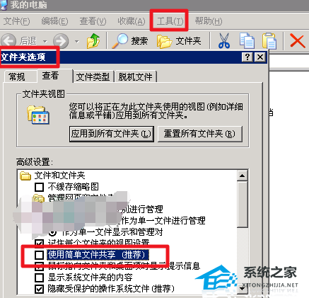8、并且将的文件夹工具选项中使用简单文件共享前面的勾去掉。