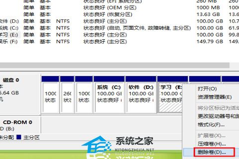 2、可以看到“学习(E)”磁盘分区未被合并对象,右击“学习(E)”,然后在出现的菜单栏中点击“删除卷”。