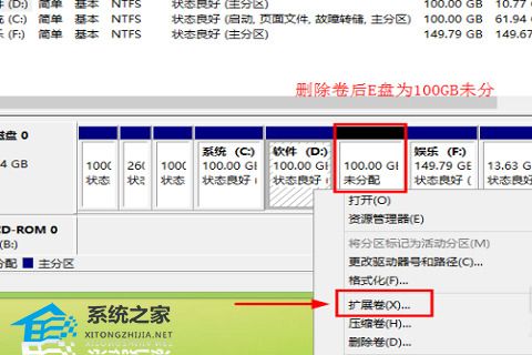 4、将未分配的合并到“软件(D)”,右键点击“软件(D)”,选择“扩展卷”。