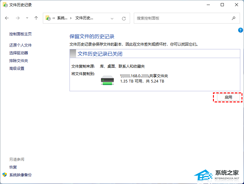 3、与Windows 10相同,在此弹出窗口中,您可以单击左侧窗格中的“选择驱动器”来添加目标设备。它还允许您添加网络位置。然后单击“启用”以打开它。您也可以随时关闭它。