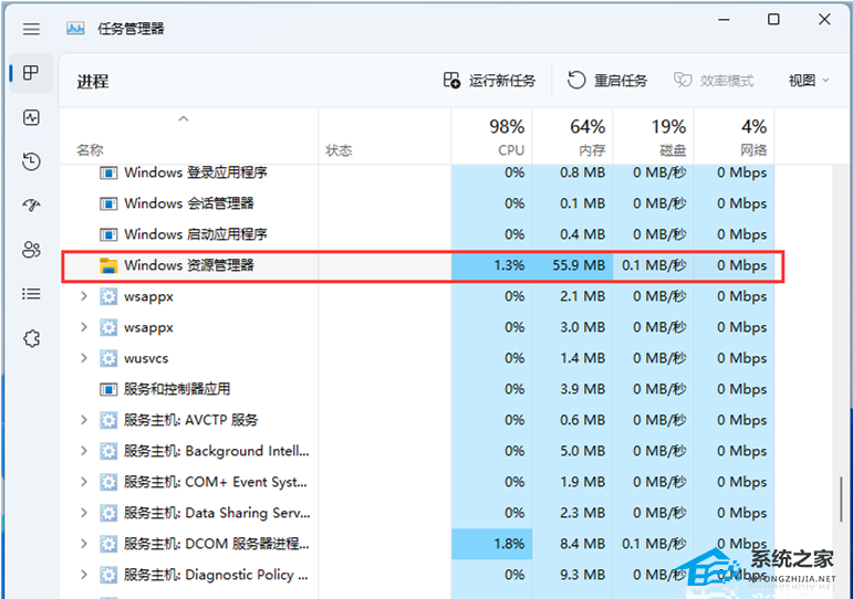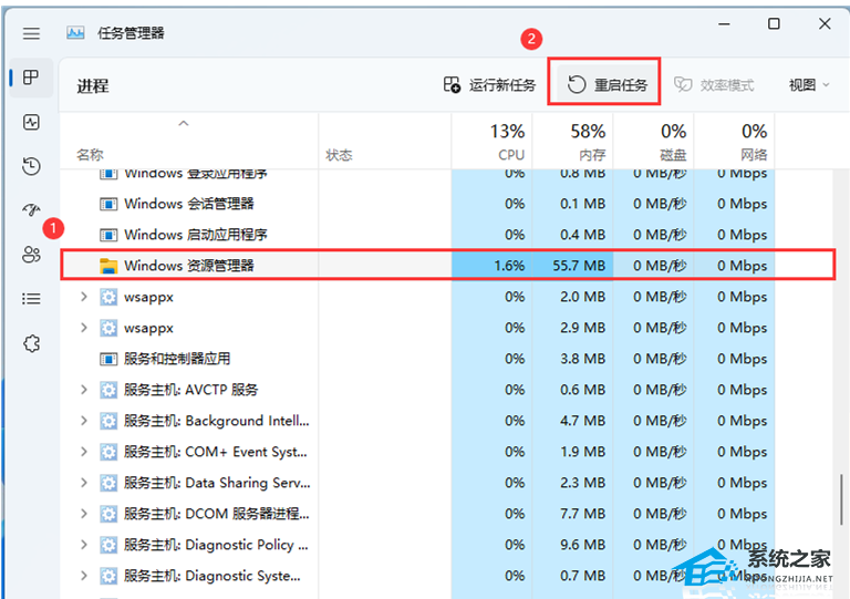 3. 选择【Windows 资源管理器】进程后,再点击右上方的【重启任务】,即可重启Windows 资源管理器,这其实是Windows 资源管理器进程explorer.exe结束后,又重新启动的过程;
