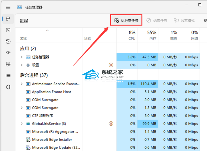 4. 如果不小心结束了Windows 资源管理器进程,也可以在任务管理器窗口,点击右上方的【运行新任务】;