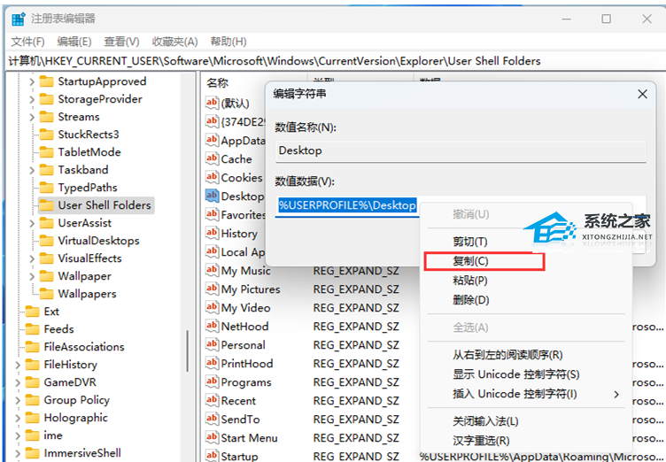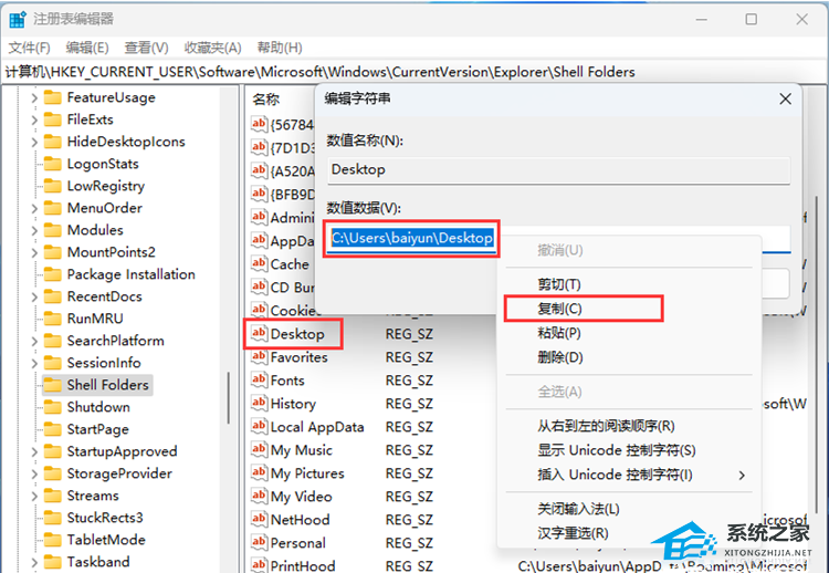 4. 编辑字符串窗口中,右键点击【Desktop】数值数据,在右键菜单中点击【复制】,将【C:UsersaiyunDesktop】复制到记事本中;