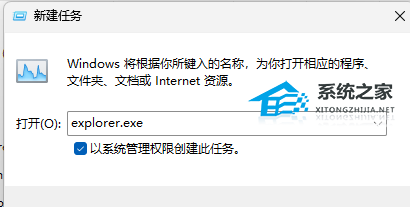 5. 新建任务窗口,输入【explorer.exe】命令,按【确定或回车】,即可重新启动Windows 资源管理器(建议勾选以系统管理权限创建此任务)。