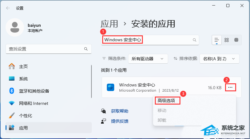2. 设置窗口,①搜索【Windows 安全中心】②点击【Windows 安全中心旁边的按钮】③点击【高级选项】;