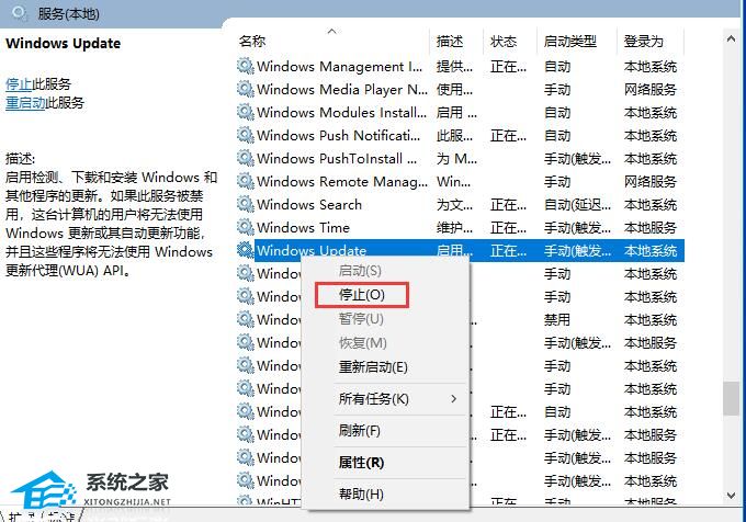4. 这时会打开Windows10服务列表,在列表中找到Windows Update服务项,然后右键点击该服务项,在弹出菜单中选择“停止”菜单项。