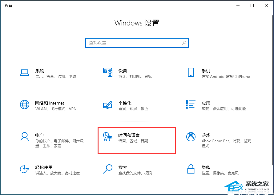 2. Windows 设置窗口,搜索框可以查找设置,也可以直接点击【时间和语言(语音、区域、日期)】;
