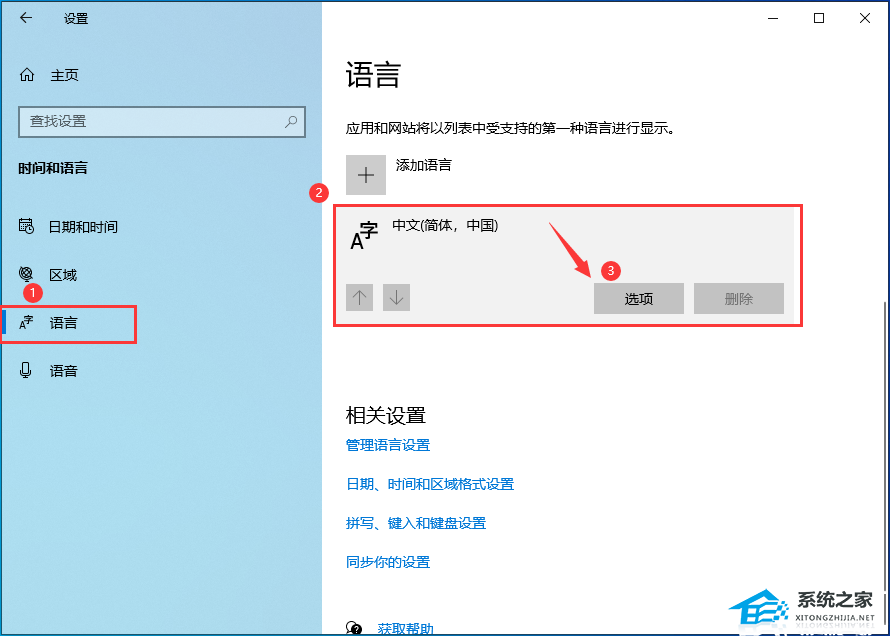 3. 时间和语言主页设置窗口,左侧点击【语言】,右侧点击【中文(简体,中国)】,然后选择【选项】;