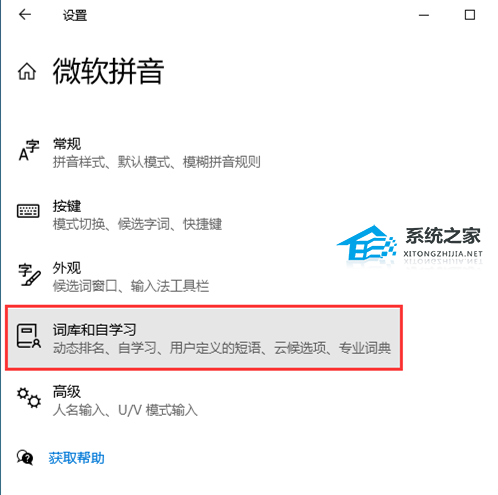 5. 点击【词库和自学习(动态排名、自学习、用户定义的短语、云候选项、专业词典)】;