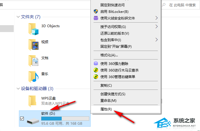 3. 接着我们找到自己想要优化的硬盘,右键单击该硬盘,然后在菜单列表中选择属性选项。