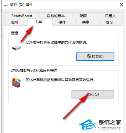 4. 进入硬盘属性页面之后,我们在该页面中打开工具选项,然后在工具页面中点击优化选项。