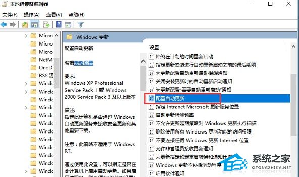 2. 在本地组策略编辑器的界面左侧依次展开“计算机配置”-“管理模板”-“Windows组件”-“Windows 更新”-“配置自动更新”。