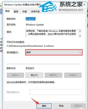 2. 找到”Windows Update“打开,点击启动类型选择禁用,点击确定完成。