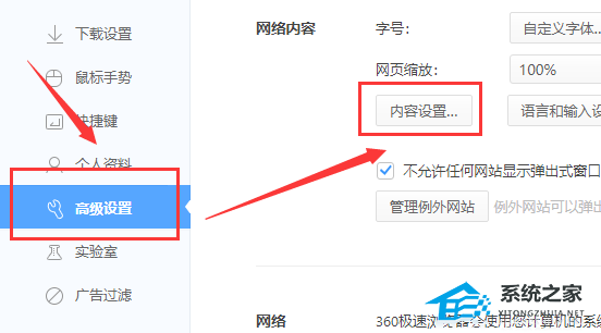 3. 在左侧的选项中点击“高级设置”进入,点击“网页内容高级设置”。